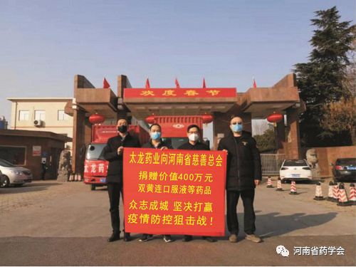 1月31日,河南太龙药业股份有限公司向河南省慈善总会捐赠双黄连口服液等药品一批,价值400余万元,用于疫情防治。